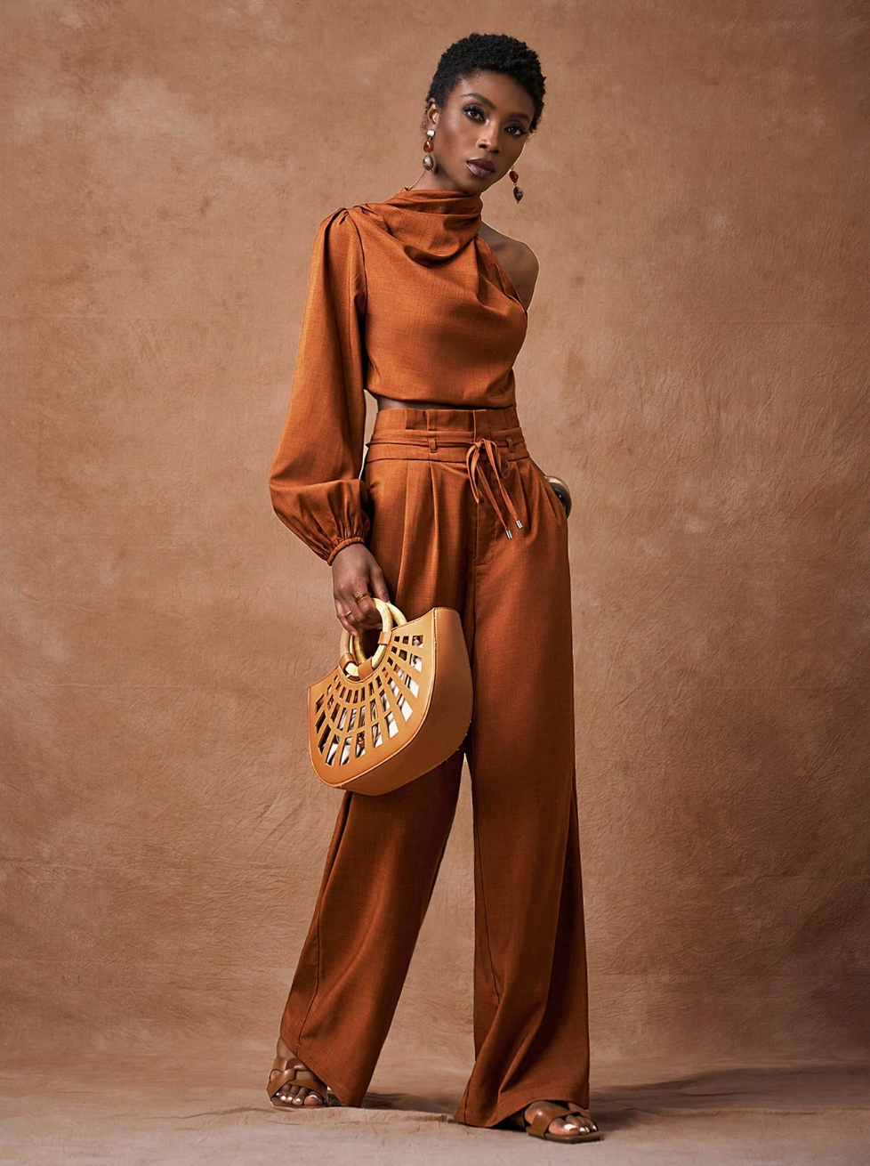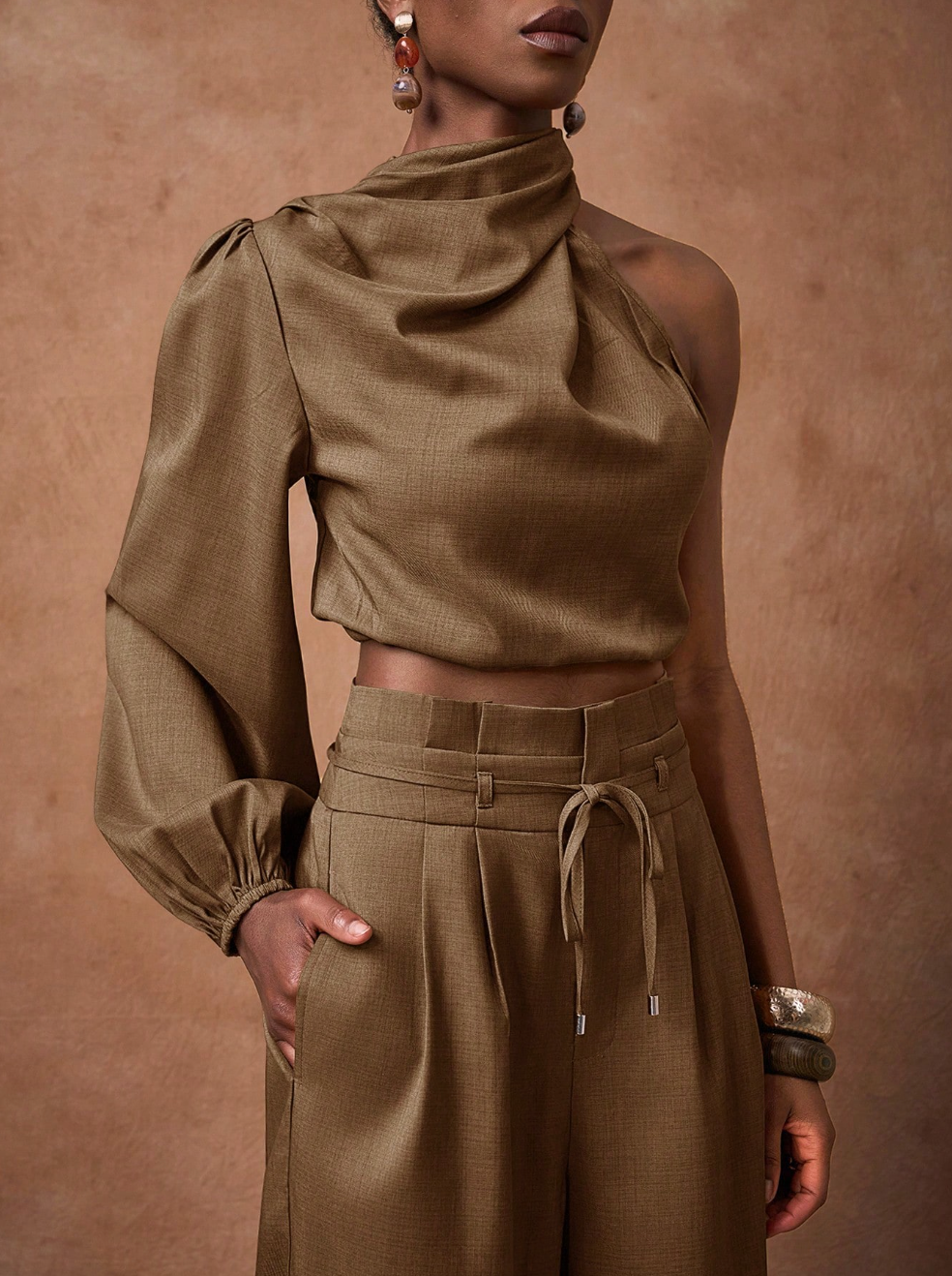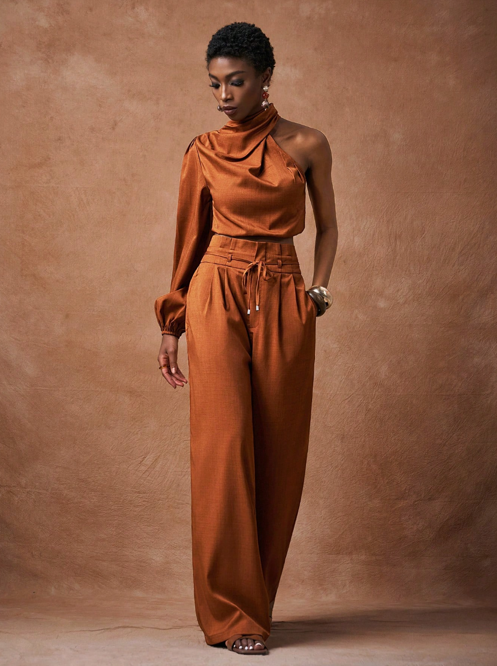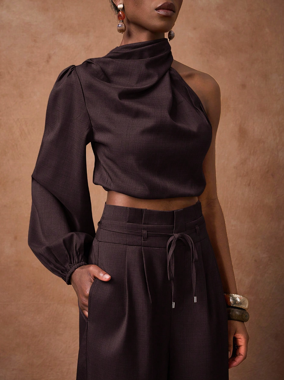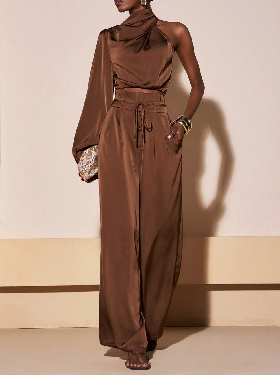 Scopri il set SAMIRA, la scelta perfetta per chi desidera eleganza senza compromessi. Questo abbinamento sofisticato comprende una camicia corta in marrone con maniche lunghe e spalla scoperta, caratterizzata da un affascinante collo a swing, accoppiata a pantaloni a vita alta con gamba ampia. Un'armatura di tendenza che valorizza la silhouette e rispecchia il tuo gusto per i dettagli curati.