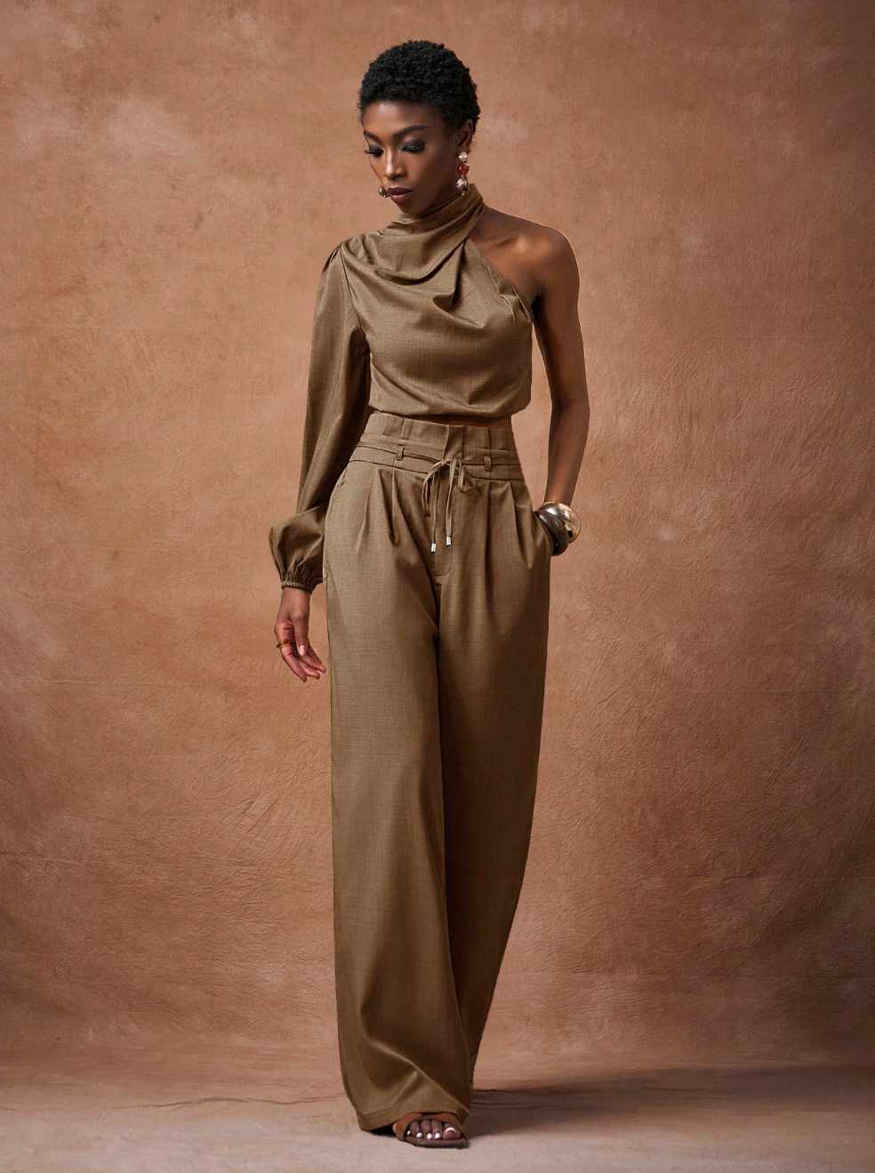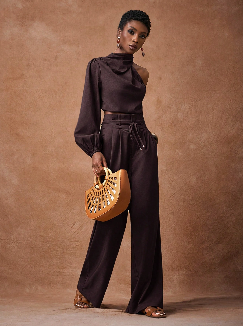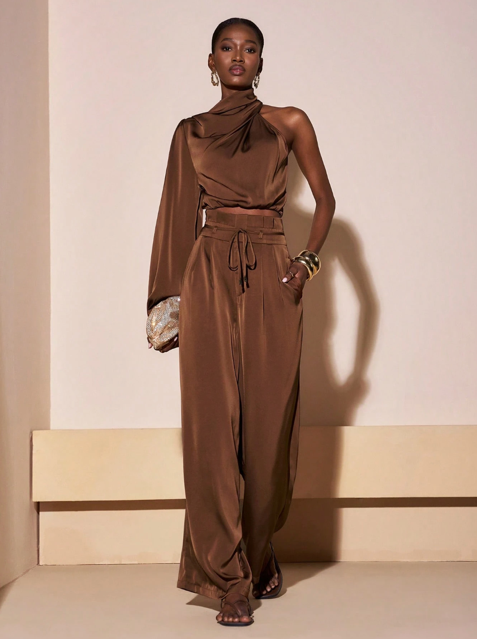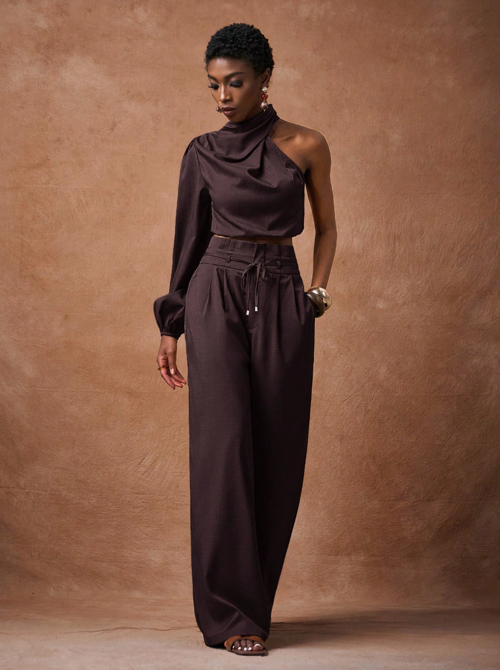 Scopri il set SAMIRA, la scelta perfetta per chi desidera eleganza senza compromessi. Questo abbinamento sofisticato comprende una camicia corta in marrone con maniche lunghe e spalla scoperta, caratterizzata da un affascinante collo a swing, accoppiata a pantaloni a vita alta con gamba ampia. Un'armatura di tendenza che valorizza la silhouette e rispecchia il tuo gusto per i dettagli curati.