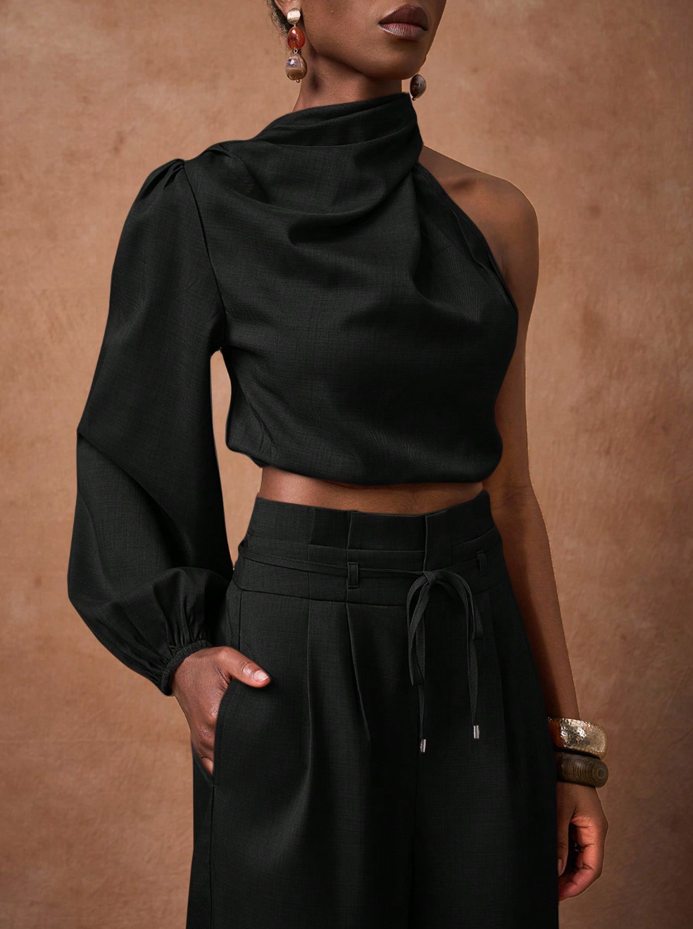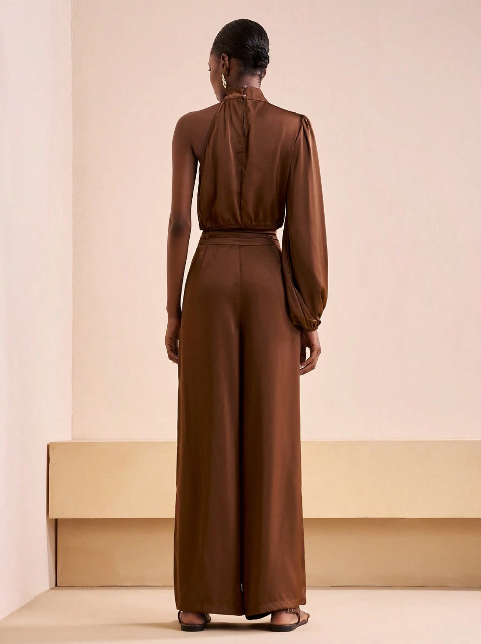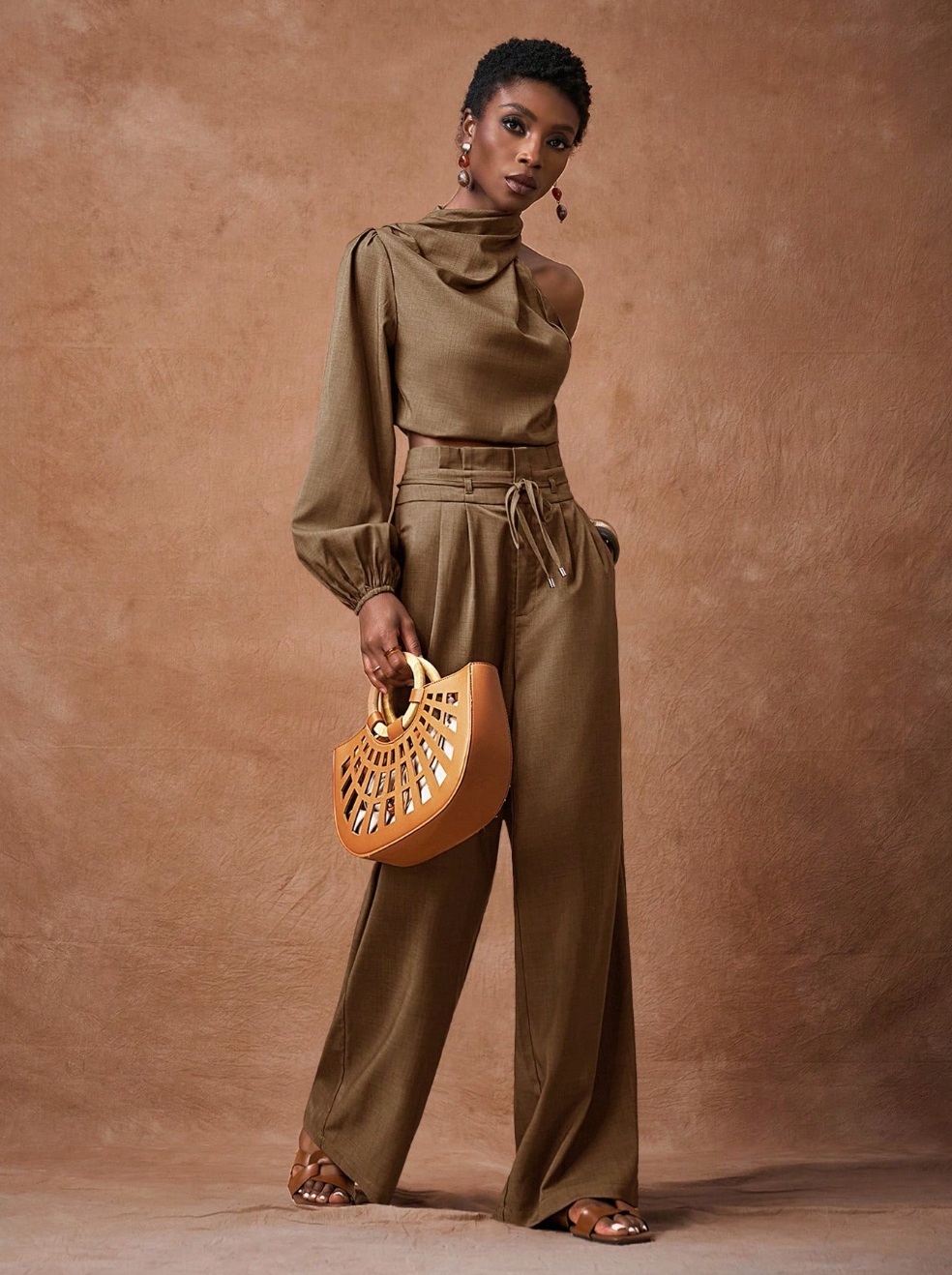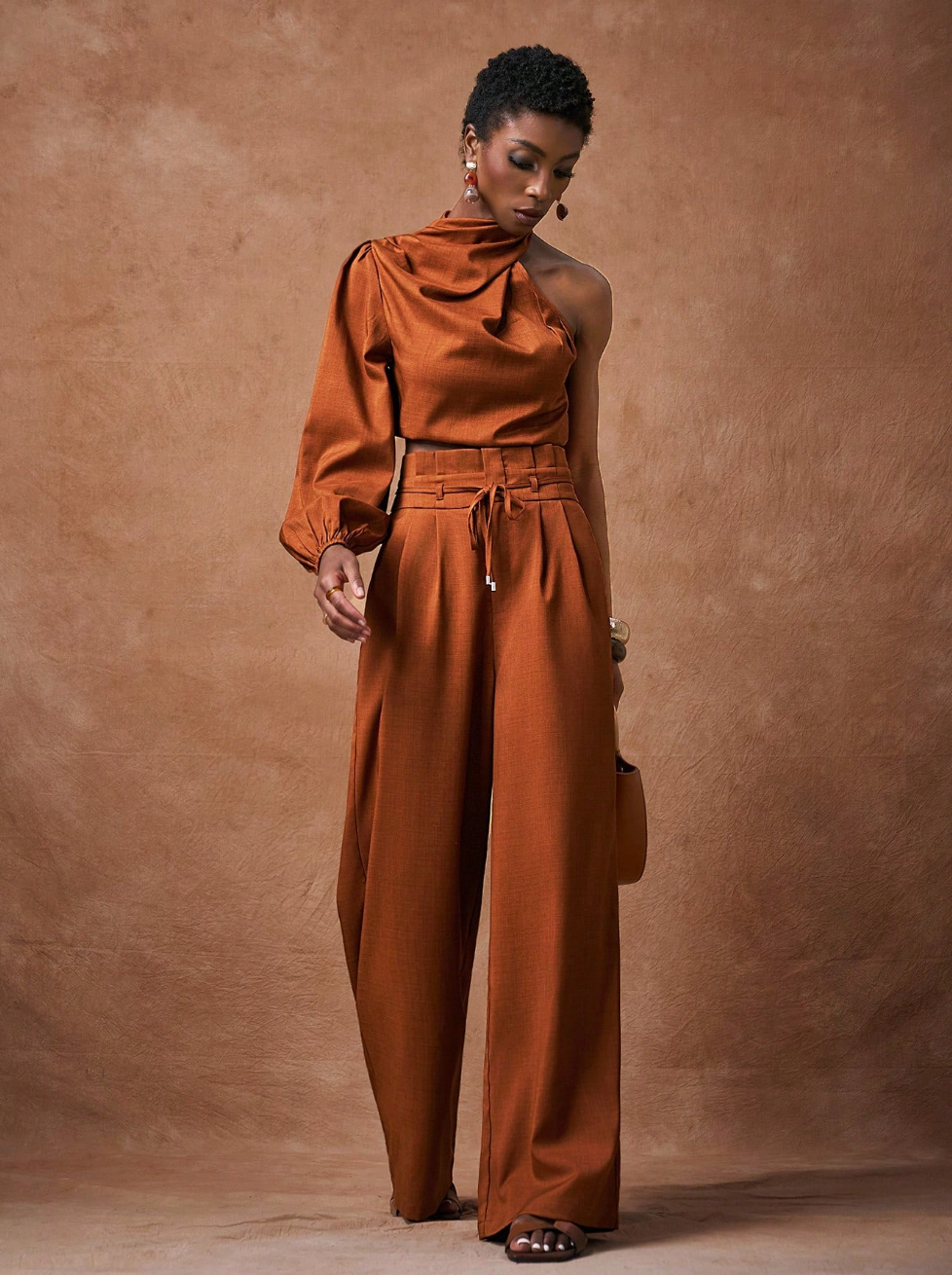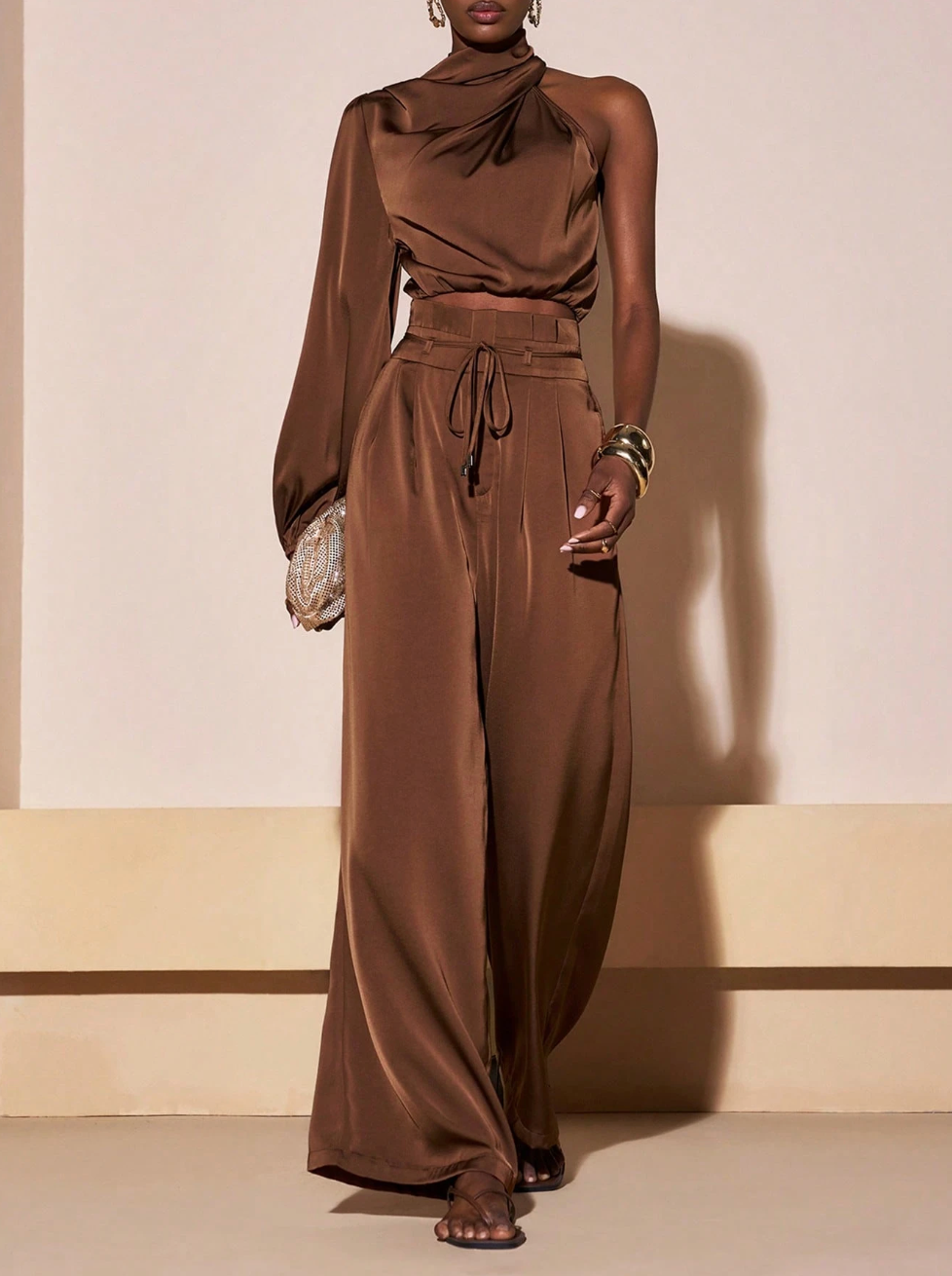 Scopri il set SAMIRA, la scelta perfetta per chi desidera eleganza senza compromessi. Questo abbinamento sofisticato comprende una camicia corta in marrone con maniche lunghe e spalla scoperta, caratterizzata da un affascinante collo a swing, accoppiata a pantaloni a vita alta con gamba ampia. Un'armatura di tendenza che valorizza la silhouette e rispecchia il tuo gusto per i dettagli curati.